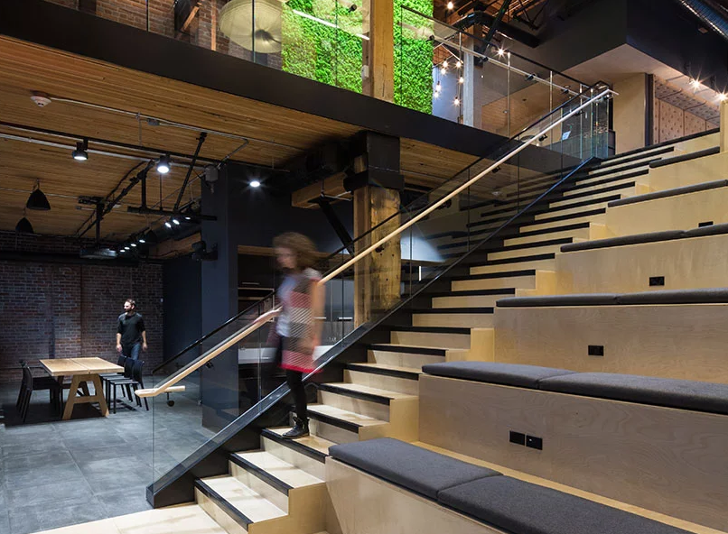 從結(jié)構(gòu)和建筑規(guī)范的角度來看,需要實施多種創(chuàng)新的替代解決方案,以便在三層樓的幾個獨立防火室中創(chuàng)造連續(xù)流動的空間。在這個辦公室裝修項目中,萊基工作室尋求整合現(xiàn)有的裸露結(jié)構(gòu)磚,重型木材梁和機械基礎(chǔ)設(shè)施與當(dāng)代細節(jié)和日常的實用材料。