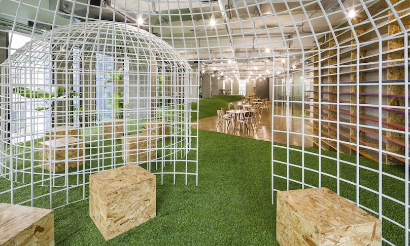 與暴露在外的混凝土地板形成鮮明對比的是,公司的標志采用了多色條紋,展示了一個由一群五顏六色的人建造的地球儀。在其他地方的辦公室裝修設計中,類似鳥籠的結(jié)構(gòu)提供了非公開會議室的替代方案,并且可以移動以適應各種情況。