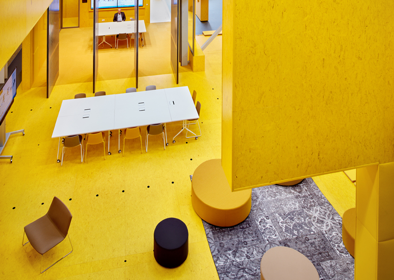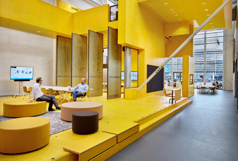 最后的辦公室裝修設計靈感來自于建筑實驗家和藝術家的一件黃色的3D小藝術品。克里金·德科寧,將大禮堂內現有的四個不同樓層連接起來,為工作提供各種解決方案。
