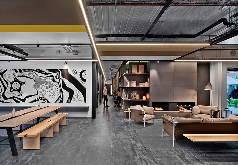 辦公室裝修的空間是模塊化的:健身房變成了一個與眾不同的頭腦風暴室,里面有腳凳座椅。辦公室裝修特定的地方被預留給高度連接、會議、測試、電話會議或注意力集中的時刻,就像在材料庫中一樣。工作站位于兩層樓的兩張大開放式辦公桌上,可促進共享、流動性、機動性和創造性。辦公室裝修中兩個綠色的大露臺提供不同的工作場所,見面或呼吸。該計劃平衡了冷暖地帶,使室內開放給戶外。他們允許模塊化空間,以一種露營的方式。橫向和縱向的聯系使人們的循環更加流動,以刺激交流和接觸。